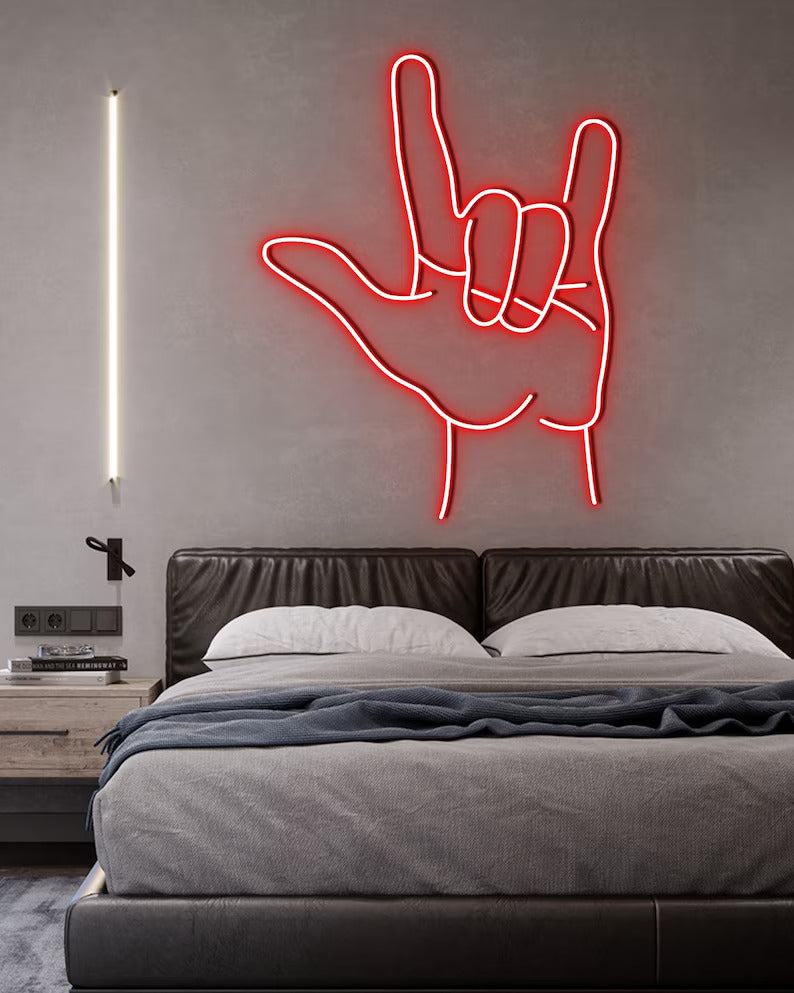 Bring your rock and roll dreams to life with this illuminated Rock Hand Neon Sign. This neon light is custom-made and features a cool hand design with LED lighting technology for a bright, long lasting glow. Its low energy usage makes it cost-efficient with up to 50,000 hours in life expectancy.